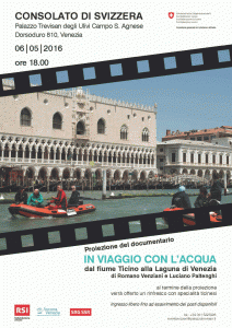 Il documentario “In viaggio con l’acqua” racconta il tragitto di un gruppo di personalità della Svizzera italiana che in nove giorni percorre il corso del fiume Ticino, superando il Lago Maggiore e i Navigli, per raggiungere il fiume Po e la Laguna di Venezia. Attraverso immagini e interviste, si rivive l’avventura di Romano Veneziani, giornalista della RSI (Radiotelevisione Svizzera), Luciano Paltenghi, autore delle immagini e del montaggio, e Luca Maccanetti, tecnico del suono. Il filmato è stato realizzato nel maggio 2015 nell’ambito del progetto “Alpi – Expo – Venezia”.