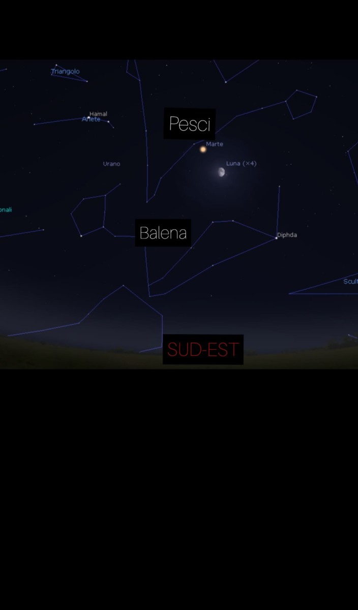 La congiunzione (minima distanza angolare) tra la Luna e Marte avrà luogo intorno alle 21. La Luna brillerà nella costellazione della BALENA, e Marte nella vicina costellazione dei PESCI.
