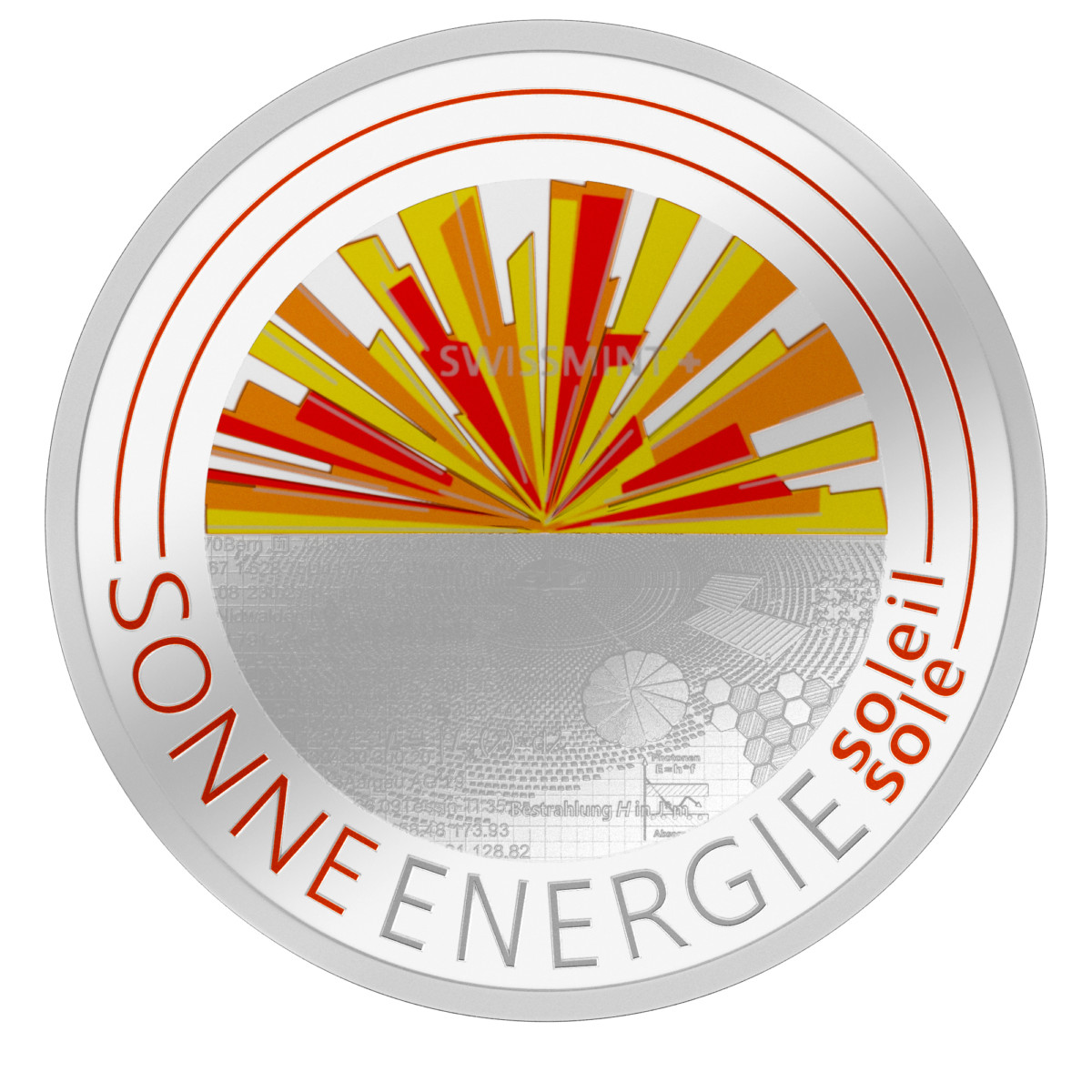 Il 21 luglio 2022 la Zecca federale Swissmint lancerà la nuova moneta d’argento «Energia solare», la seconda della serie di tre monete riguardanti il tema dell’«energia del futuro». Moneta d’argento a colori con elementi fluorescenti «Energia solare», valore nominale: 20 franchi